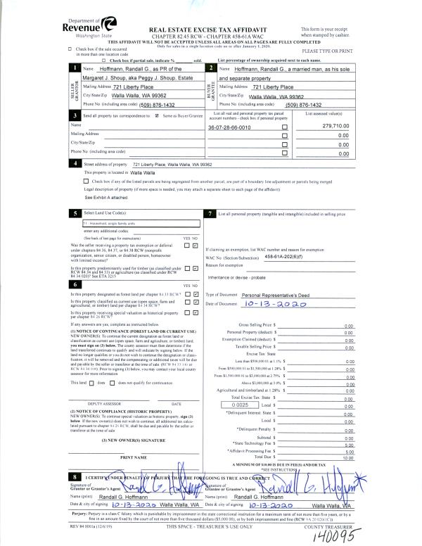 | 2 | 10/13/2020 | DPR | DEED OF PERSONAL REPRESENTATIVE | SHOUP PEGGY J | HOFFMANN RANDALL G | | | | 140095 | 2020-10612 |