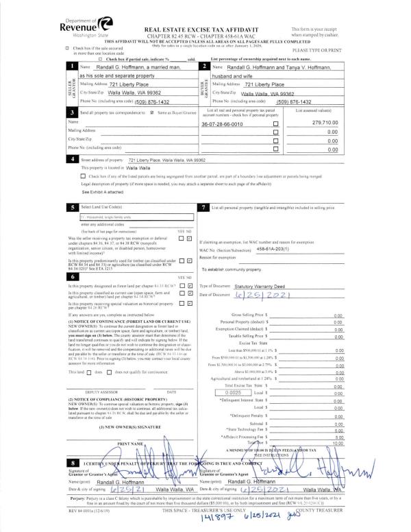 | 1 | 06/25/2021 | SWD | STATUTORY WARRANTY DEED | HOFFMANN RANDALL G | HOFFMANN RANDAL G & TANYA V | | | $0.00 | 141897 | 2021-07766 |