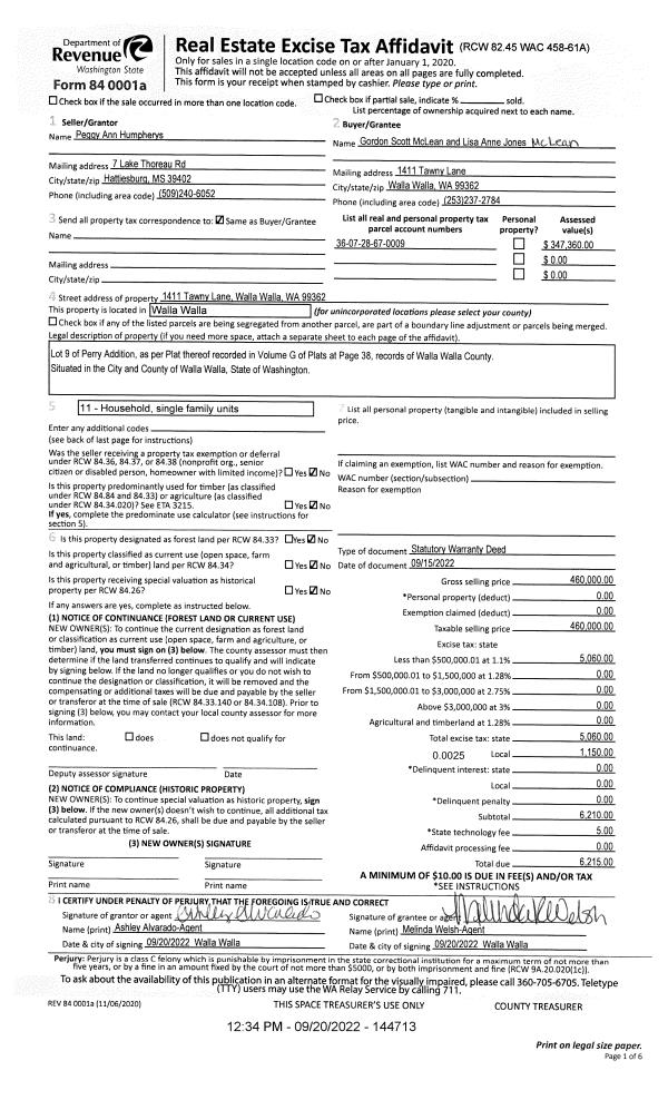 | 1 | 09/20/2022 | SWD | STATUTORY WARRANTY DEED | HUMPHERYS PEGGY ANN | MCLEAN GORDON SCOTT & LISA ANNE JONES | | | $460,000.00 | 144713 | 2022-07832 |