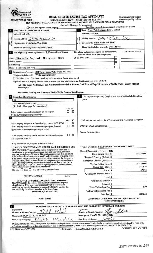 | 2 | 05/16/2013 | WARRANTY D | WARRANTY DEED | MELIAH, DAVID P & JILL K | SCHENK, RYAN W & JANA L | | | $188,700.00 | 123974 | 2013-04920 |
