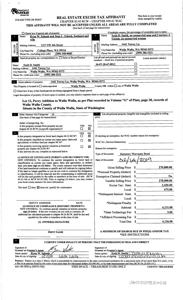 | 1 | 02/20/2019 | SWD | STATUTORY WARRANTY DEED | SCHENK RYAN W & JANA L | SMITH SCOTT D | | | $270,000.00 | 136409 | 2019-01108 |