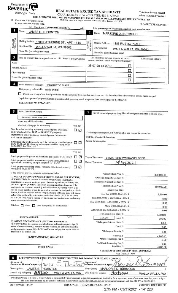 | 1 | 03/31/2021 | SWD | STATUTORY WARRANTY DEED | THORNTON JAMES E | BURMOOD MARJORIE D | | | $360,000.00 | 141228 | 2021-03753 |