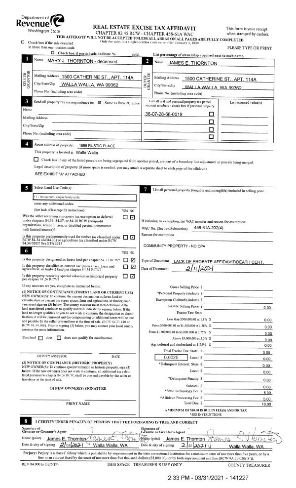 | 2 | 03/31/2021 | LOPA | LACK OF PROBATE AFFIDAVIT | THORNTON JAMES E & MARY J | THORNTON JAMES E | | | $0.00 | 141227 | 2021-03752 |