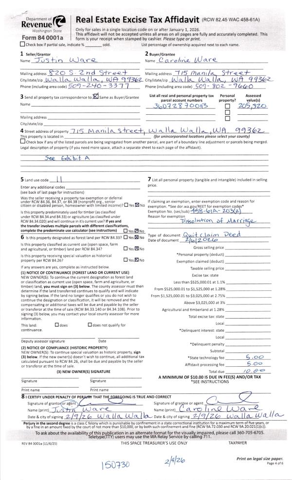 | 1 | 02/09/2026 | QCD | QUIT CLAIM DEED | WARE JUSTIN & CAROLINE | WARE CAROLINE | | | | 150730 | 2026-00787 |