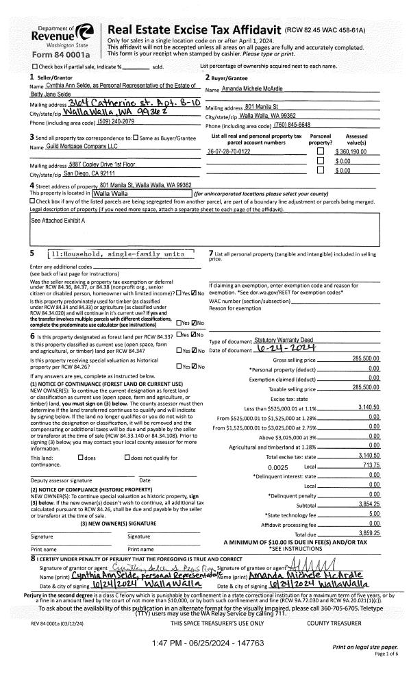 | 1 | 06/25/2024 | SWD | STATUTORY WARRANTY DEED | SELDE BETTY JANE ESTATE OF | MCARDLE AMANDA MICHELE | | | $285,500.00 | 147763 | 2024-03380 |