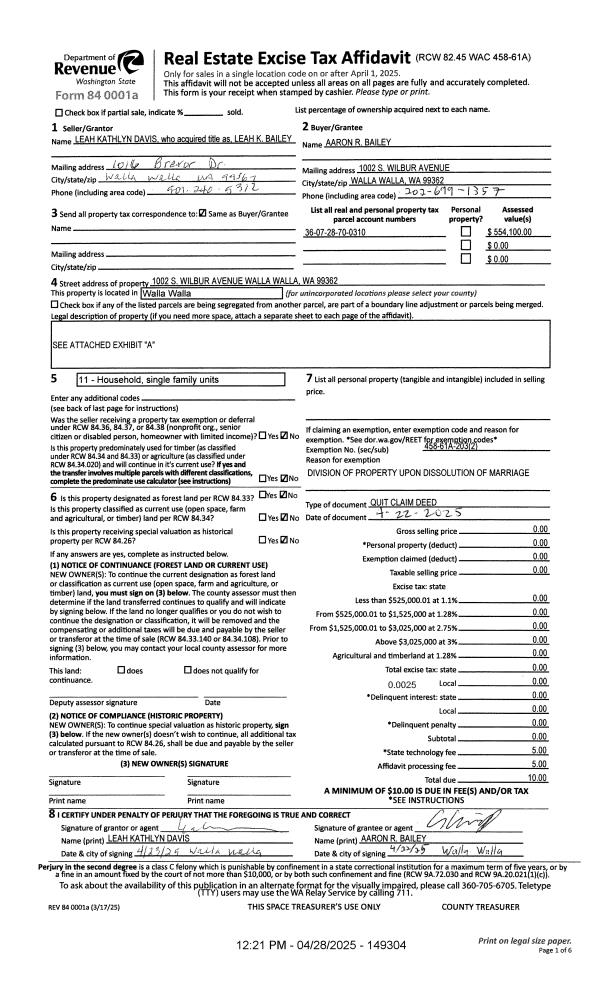 | 1 | 04/28/2025 | QCD | QUIT CLAIM DEED | BAILEY AARON R & LEAH K | BAILEY AARON R | | | | 149304 | 2025-02259 |