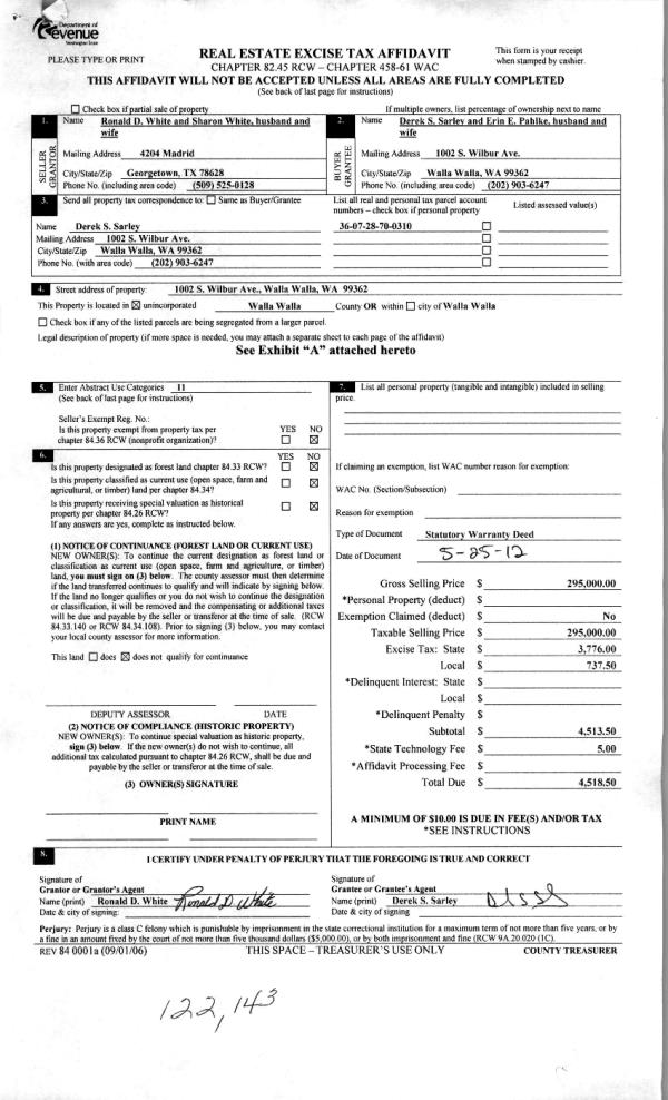 | 3 | 06/06/2012 | WARRANTY D | WARRANTY DEED | WHITE, RONALD D & SHARON L | SARLEY, DEREK S | | | $295,000.00 | 122143 | 2012-04665 |