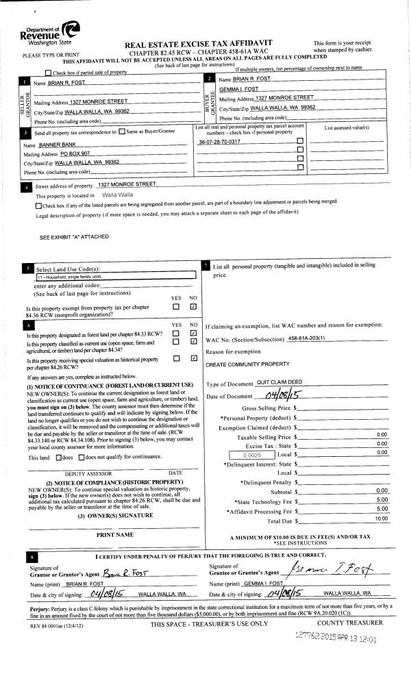 | 1 | 04/08/2015 | QCD | QUIT CLAIM DEED | FOST BRIAN R | FOST BRIAN R & GEMMA I | | | $0.00 | 127762 | 2015-02970 |