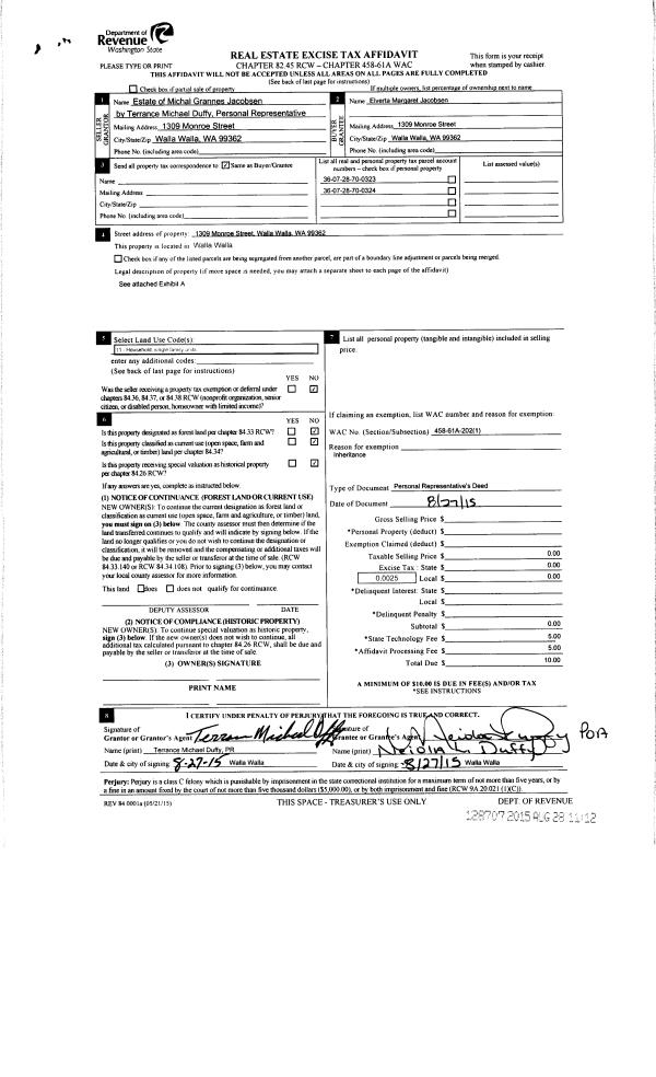 | 4 | 08/27/2015 | DPR | DEED OF PERSONAL REPRESENTATIVE | JACOBSEN MICHAL G | JACOBSEN ELVERTA MARGARET | | 2-PARCLES | $0.00 | 128707 | 2015-07557 |
