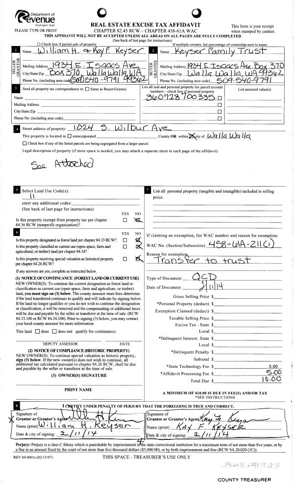 | 3 | 02/18/2014 | QCD | QUIT CLAIM DEED | KEYSER WILLIAM H | THE KEYSER FAMILY TRUST | | | | 125446 | 2014-01199 |