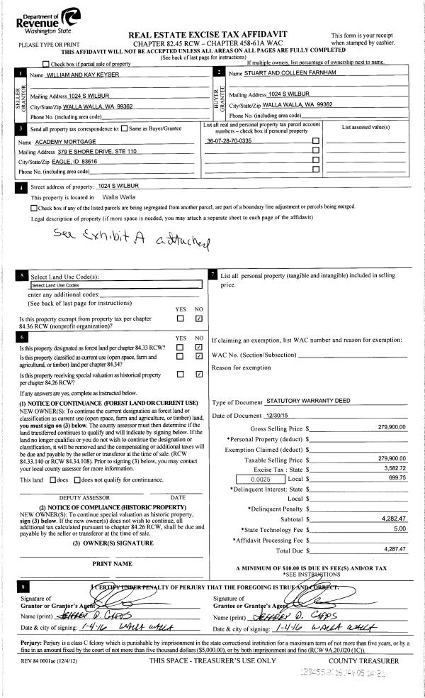 | 2 | 01/05/2016 | SWD | STATUTORY WARRANTY DEED | THE KEYSER FAMILY TRUST | FARNHAM STUART J & COLLEEN K | | | $279,900.00 | 129455 | 2016-00088 |
