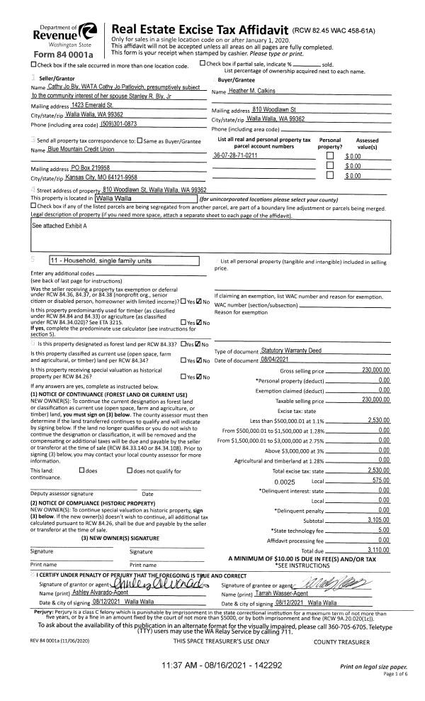 | 1 | 08/16/2021 | SWD | STATUTORY WARRANTY DEED | BLY-PATLOVICH CATHY JO | CALKINS HEATHER M | | 2-PARCELS | $230,000.00 | 142292 | 2021-09926 |