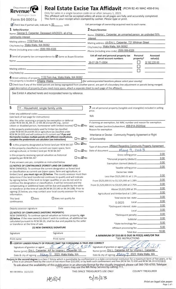| 1 | 05/15/2023 | AFFIDAVIT | AFFIDAVIT | CARPENTER GEORGE S ESTATE OF | CARPENTER VIRGINIA L | | | | 145814 | 2023-02581 |