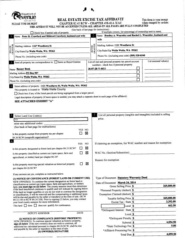 | 1 | 03/25/2014 | SWD | STATUTORY WARRANTY DEED | CRAWFORD PETER B & MILDRED S | WEARSTLER BRADLEY A & RACHEL L | | | $265,000.00 | 125612 | 2014-02001 |