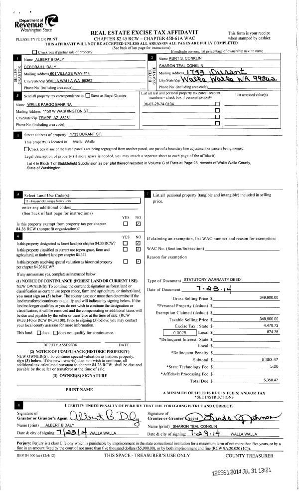 | 3 | 07/31/2014 | SWD | STATUTORY WARRANTY DEED | DALY ALBERT & DEBORAH | CONKLIN KURT S & SHARON TEAL | | | $349,900.00 | 126361 | 2014-05457 |