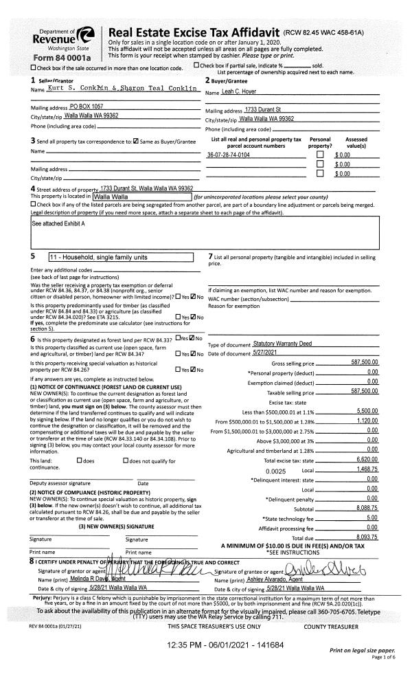 | 2 | 06/01/2021 | SWD | STATUTORY WARRANTY DEED | CONKLIN KURT S & SHARON TEAL | HOYER LEAH C | | | $587,500.00 | 141684 | 2021-06628 |