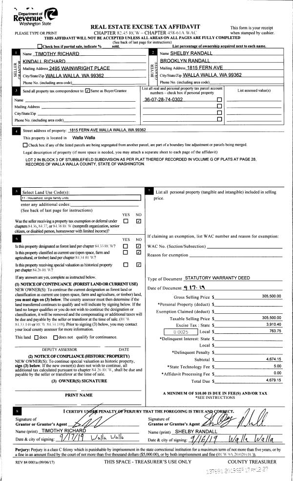 | 1 | 09/17/2019 | SWD | STATUTORY WARRANTY DEED | RICHARD TIMOTHY | RANDALL SHELBY & BROOKLYNN | | | $305,500.00 | 137691 | 2019-07248 |