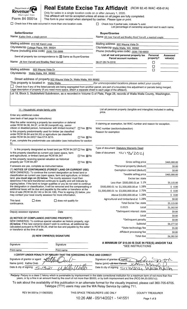 | 2 | 05/14/2021 | SWD | STATUTORY WARRANTY DEED | OREB KATHIE | VARVELL JILL ANN & BRADLEY REID | | | $465,000.00 | 141551 | 2021-05803 |