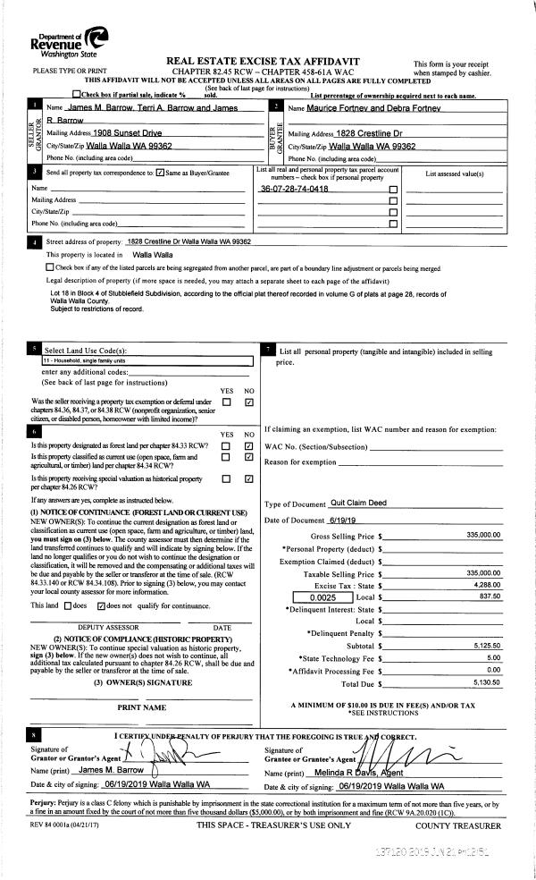| 2 | 06/21/2019 | QCD | QUIT CLAIM DEED | BARROW JAMES M & TERRI A | FORTNEY MAURICE & DEBRA | | | $335,000.00 | 137120 | 2019-04362 |